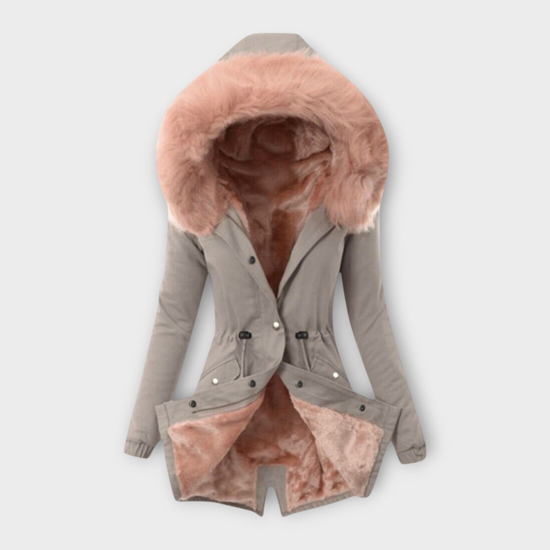 Veľkorysá kapucňa je lemovaná mäkkou umelou kožušinou, ktorá nielenže chráni pred vetrom a počasím, ale tiež pridáva nádych elegancie.