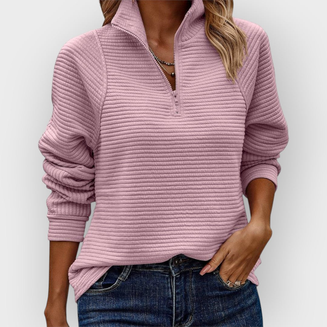 Ženský pulóver s V-výstrihom je skutočným must-have pre tvoj šatník! Jeho moderný dizajn s zipsom kombinuje štýl a funkčnosť a bez námahy sa integruje do každého outfitu – či už ležérneho alebo elegantného.